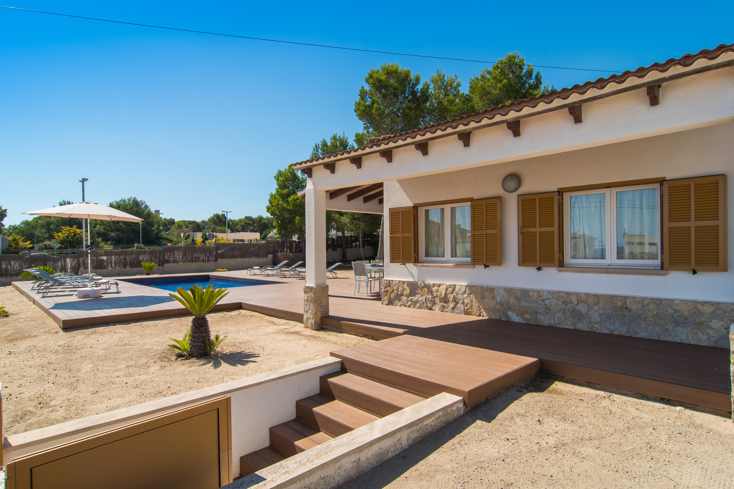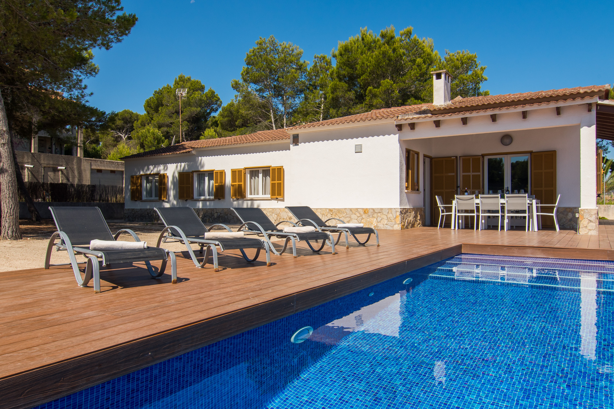En el exterior, podrás disfrutar de una espectacular piscina privada rodeada de zonas pensadas para relajarse y aprovechar al máximo el sol mediterráneo. La ubicación es inmejorable: te encontrarás en el corazón de Can Picafort, a solo un corto paseo de la playa y con todos los servicios necesarios a mano, desde restaurantes y tiendas hasta supermercados. Además, la villa cuenta con una cocina totalmente equipada, perfecta para preparar deliciosas comidas y disfrutar con familia o amigos. Ya sea que vengas a vivir el vibrante ambiente del verano o a explorar las famosas rutas de ciclismo de la isla en cualquier época del año, Villa Anglesos es el refugio perfecto para descubrir la vida de este encantador pueblo mallorquín.