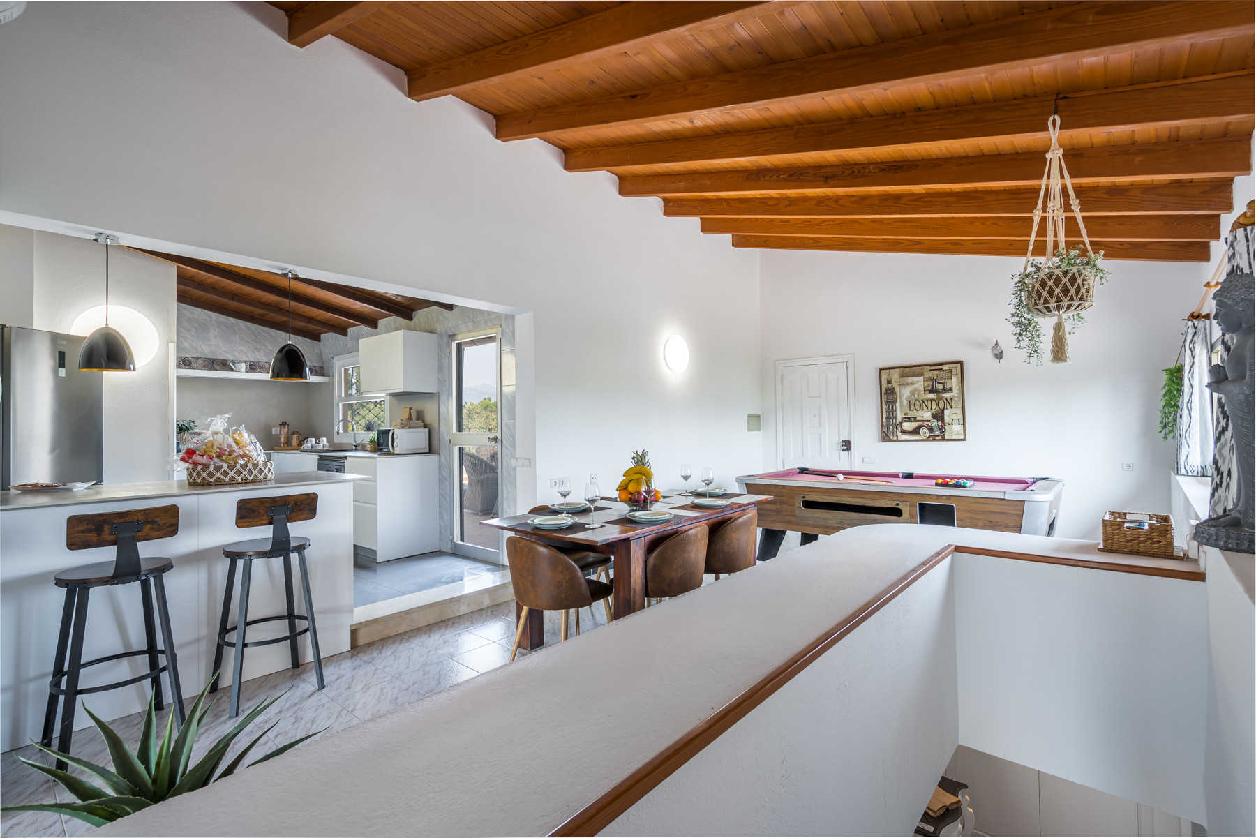 Die Unterkunft verfügt über 2 Etagen. In der oberen Etage befinden sich das Wohnzimmer mit Klimaanlage und Sat-TV, das sich neben der Küche befindet, mit Glaskeramikkochfeld, mit der es sich über eine Marmorbar verbindet. Von hier aus führen ein paar Stufen zum Esszimmer, ebenfalls mit Klimaanlage und Zugang zum Pool. Die 4 Schlafzimmer des Hauses, alle mit Klimaanlage und drei mit Schrank, befinden sich im Erdgeschoss. Drei von ihnen bieten ein Doppelbett und das vierte hat zwei Einzelbetten. Eines der Doppelbettzimmer hat ein Fenster mit Blick nur ins Hausinnere, bietet aber Zugang zur Terrasse. Außerdem verfügen zwei der Schlafzimmer über ein eigenes Bad mit Dusche. Es gibt zwei weitere Bäder mit Dusche im Haus, eines in jeder Etage. 1 Kinderbett und 1 Hochstuhl verfügbar. Es gibt eine Waschmaschine, Bügeleisen und Bügelbrett.