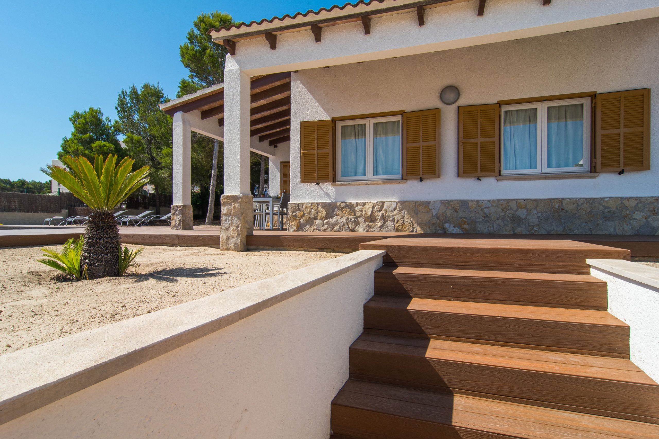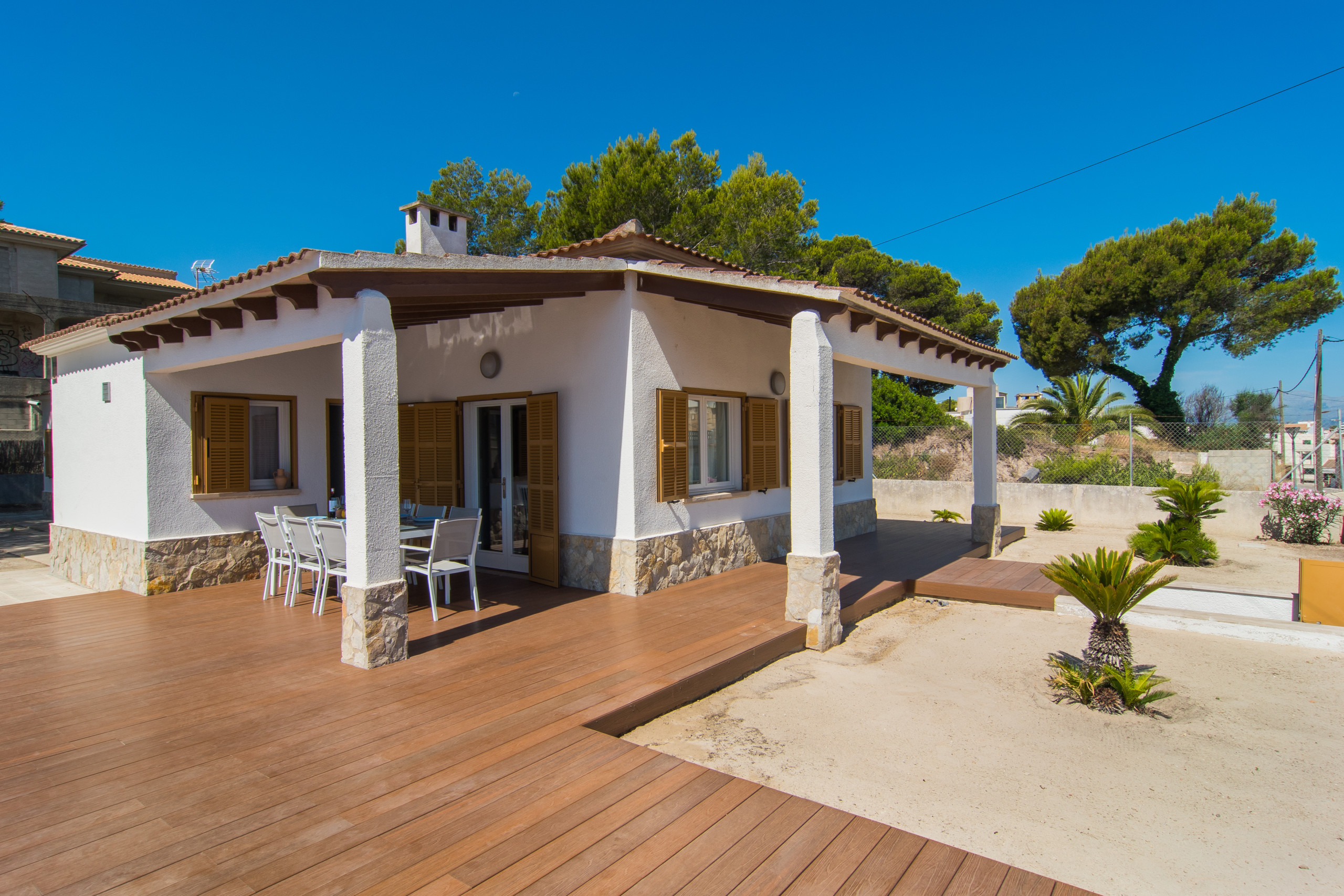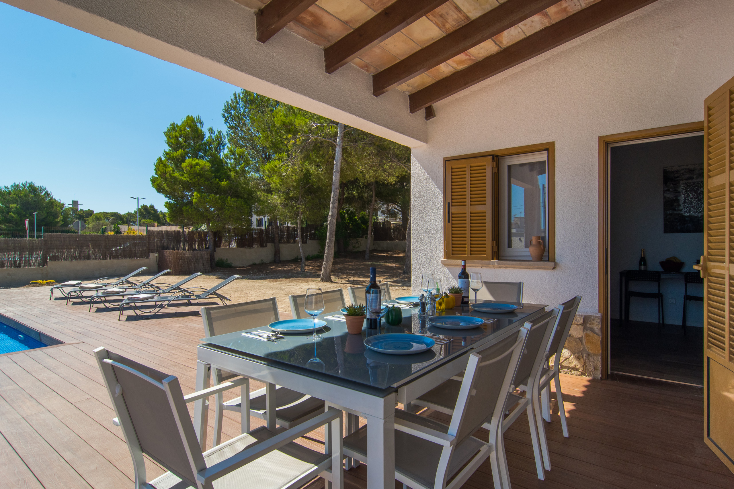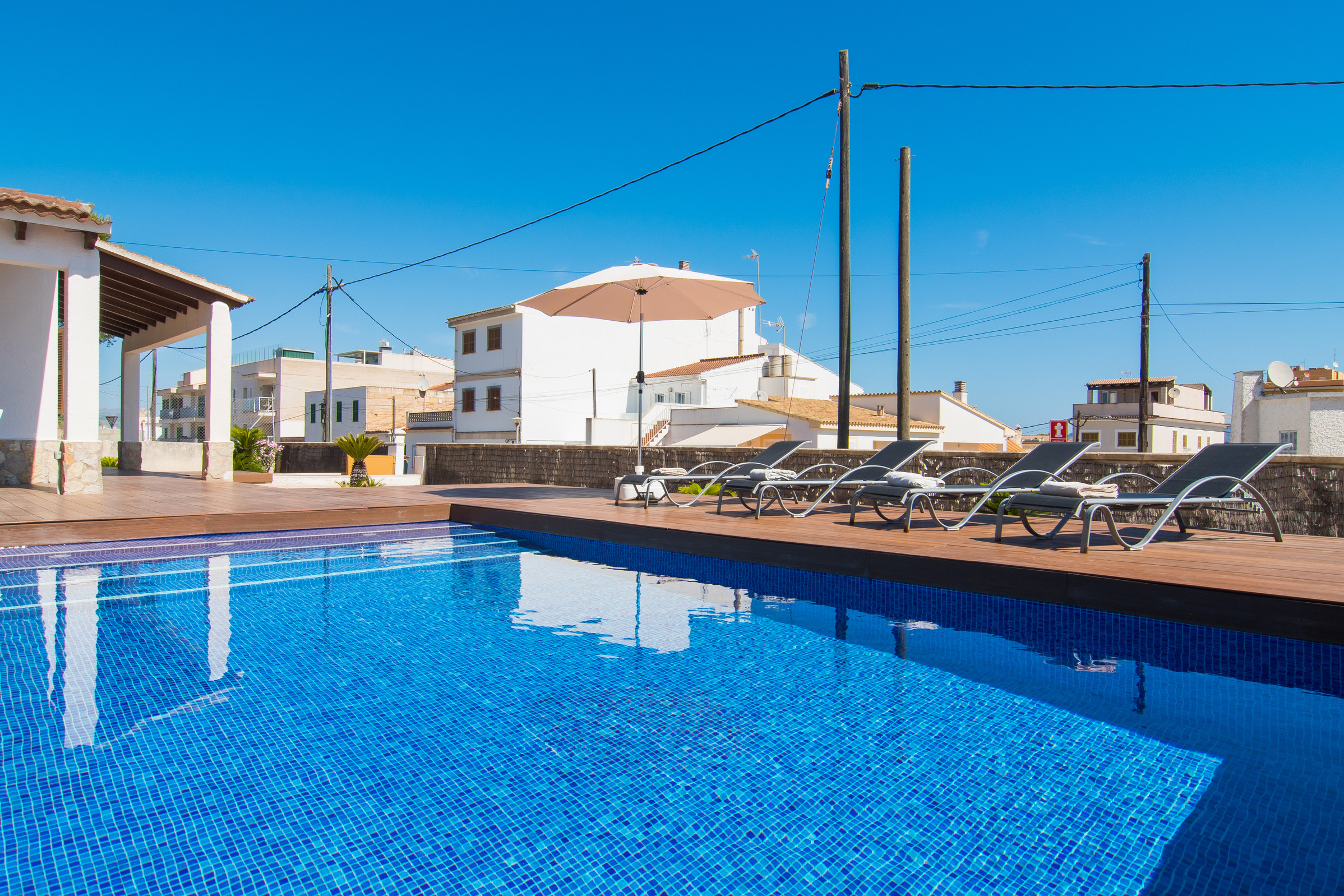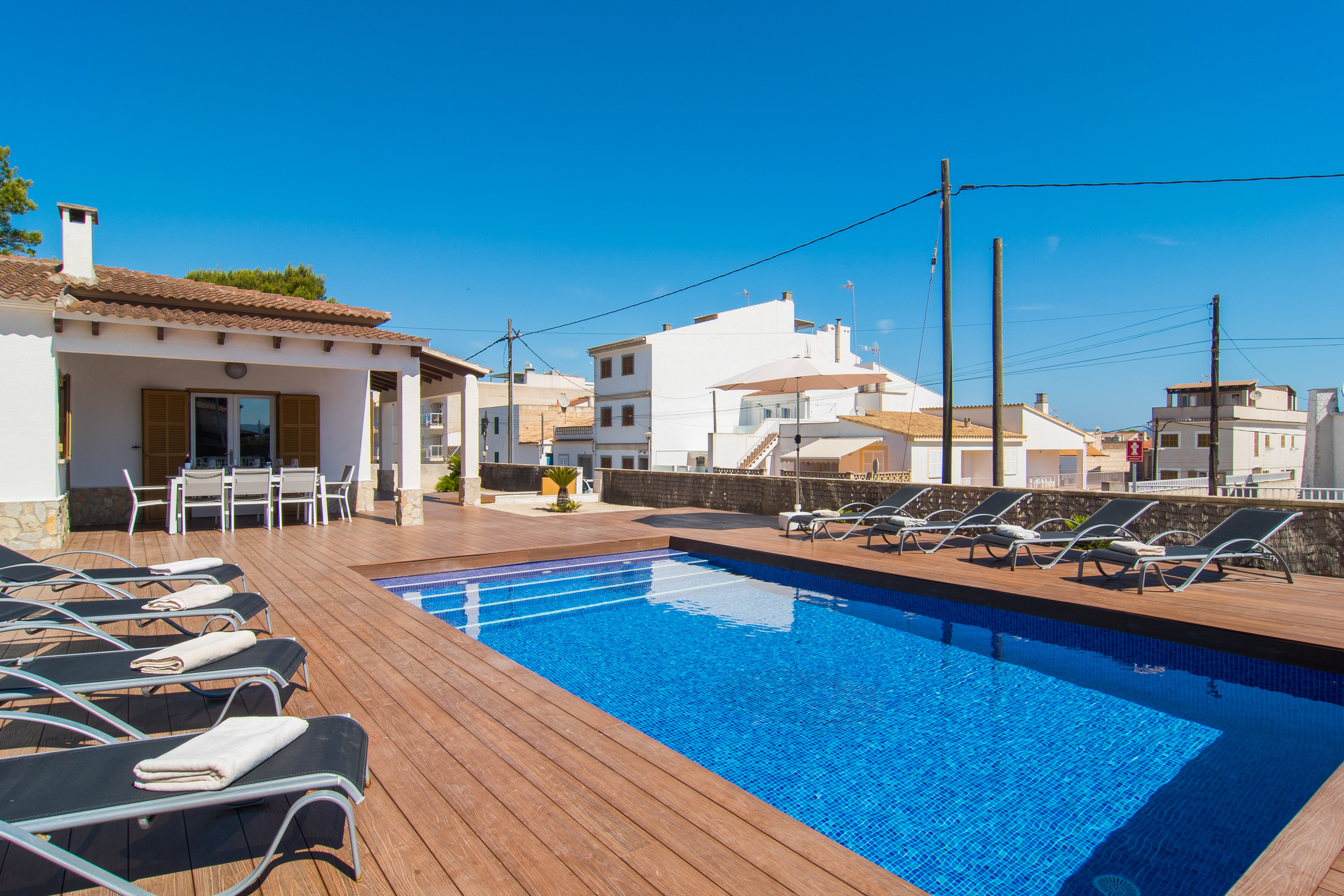 Outside, you can enjoy a spectacular private pool surrounded by areas designed to relax and make the most of the Mediterranean sun. The location is unbeatable: you will be in the heart of Can Picafort, just a short walk from the beach and with all necessary services at hand, from restaurants and shops to supermarkets. In addition, the villa has a fully equipped kitchen, perfect for preparing delicious meals and enjoying time with family or friends. Whether you come to live the vibrant summer atmosphere or to explore the famous cycling routes of the island at any time of the year, Villa Anglesos is the perfect refuge to discover the life of this charming Mallorcan village.